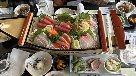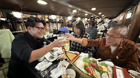 今回の参加者は『屋形船初めて!』という方も多く、刺身の舟盛りや揚げたて天ぷらなど美味しい料理を楽しんだり、デッキで心地よい夜風にあたりながらレインボーブリッジやお台場の夜景を楽しんだり、カラオケや抽選会で大いに盛り上がったりと、楽しい時間はあっという間に過ぎました。