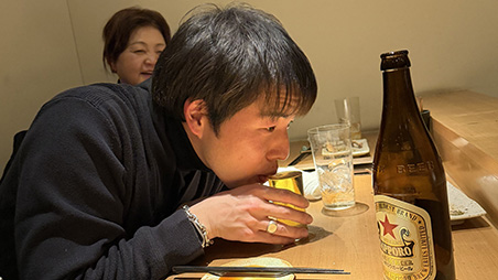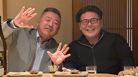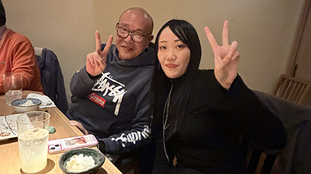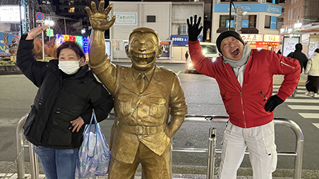 楽しい時間を過ごしたあと、駅前のこち亀オブジェを見つけた社長は大はしゃぎで両さんと写真撮影。(陽気すぎる酔っ払い…笑)